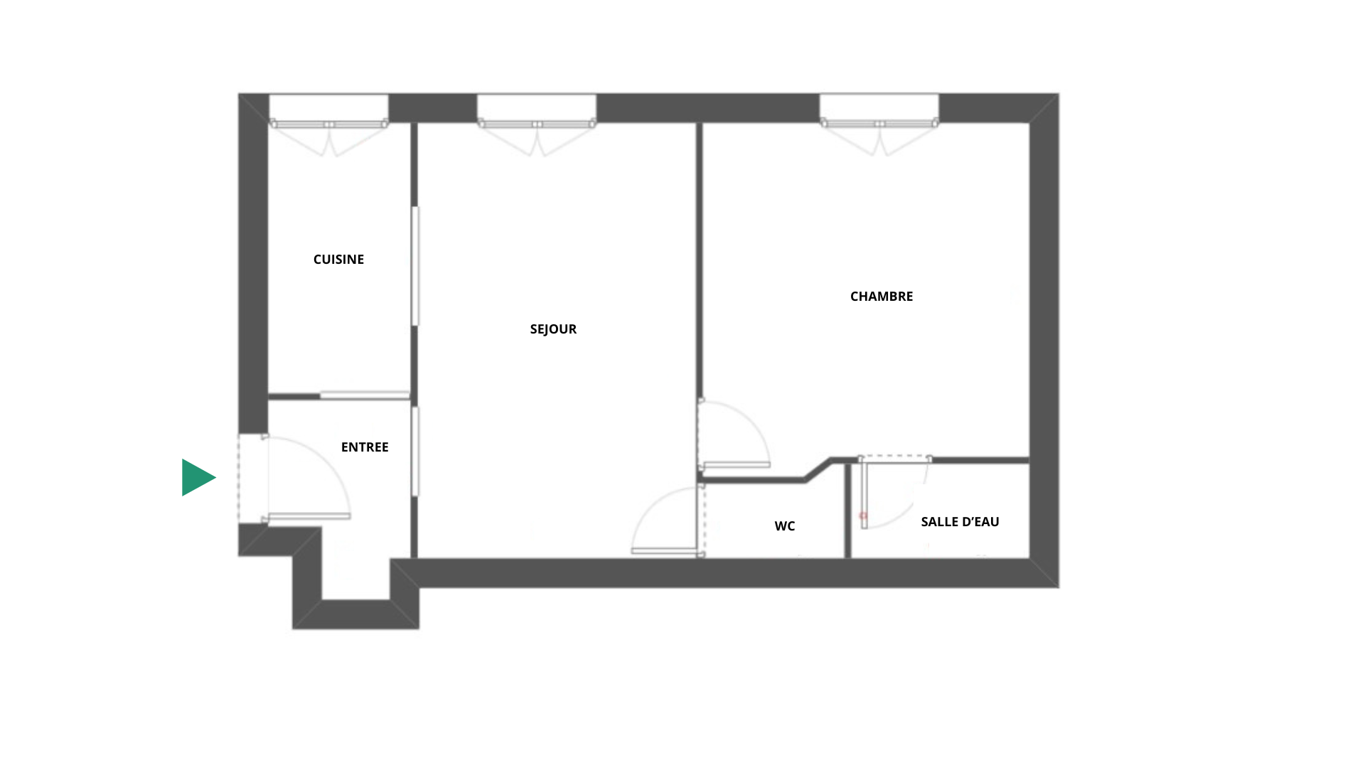 Appartement calme dans une cour intérieur au rez-de-chaussée d'un immeuble de 4 étages comprenant : une entrée, un séjour, une cuisine semi ouverte, une chambre, une salle d'eau et un WC séparés.