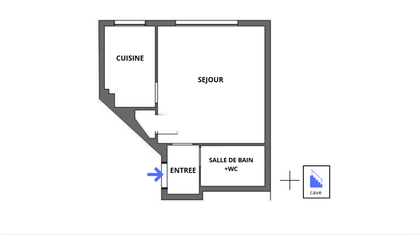 Au 2ème étage d'un immeuble avec ascenseur comprenant : une entrée, une pièce de vie, une cuisine et une salle de bain avec WC.