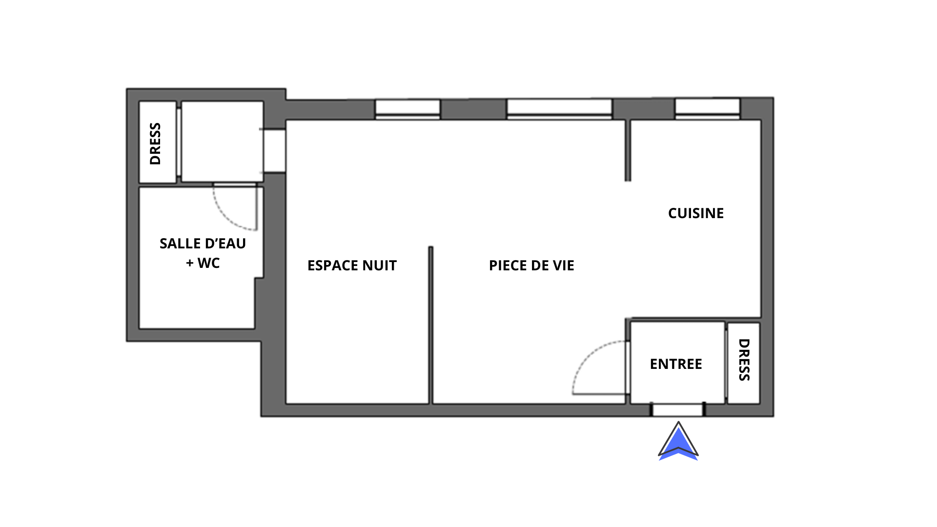 Au rez-de-chaussée d'un immeuble comprenant : une entrée avec placard qui dessert un séjour avec une cuisine ouverte et équipée, un espace nuit et une salle d'eau avec WC.