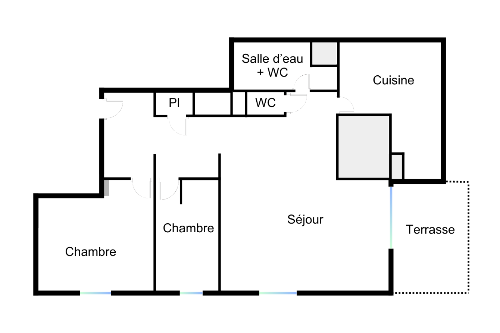 Il se divise en une entrée avec dressing, un grand séjour à la vue dégagée, une cuisine séparée équipée, deux chambres (11,25 m2), une salle d'eau avec WC, des toilettes séparées.